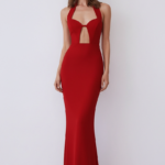 A sleek halter-neck dress with a sculpted bodice and refined front cut-out. The fitted silhouette flows into a floor-length skirt, creating a powerful and elegant evening look.