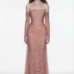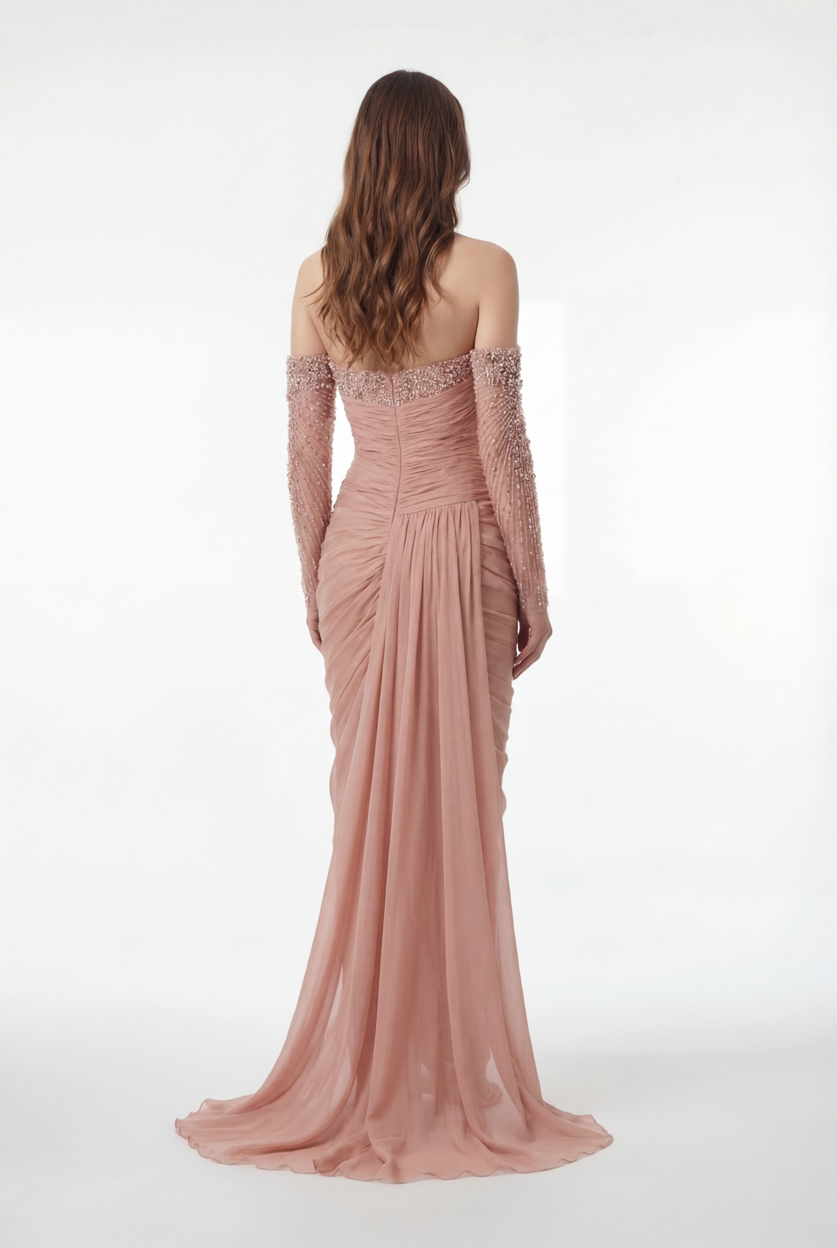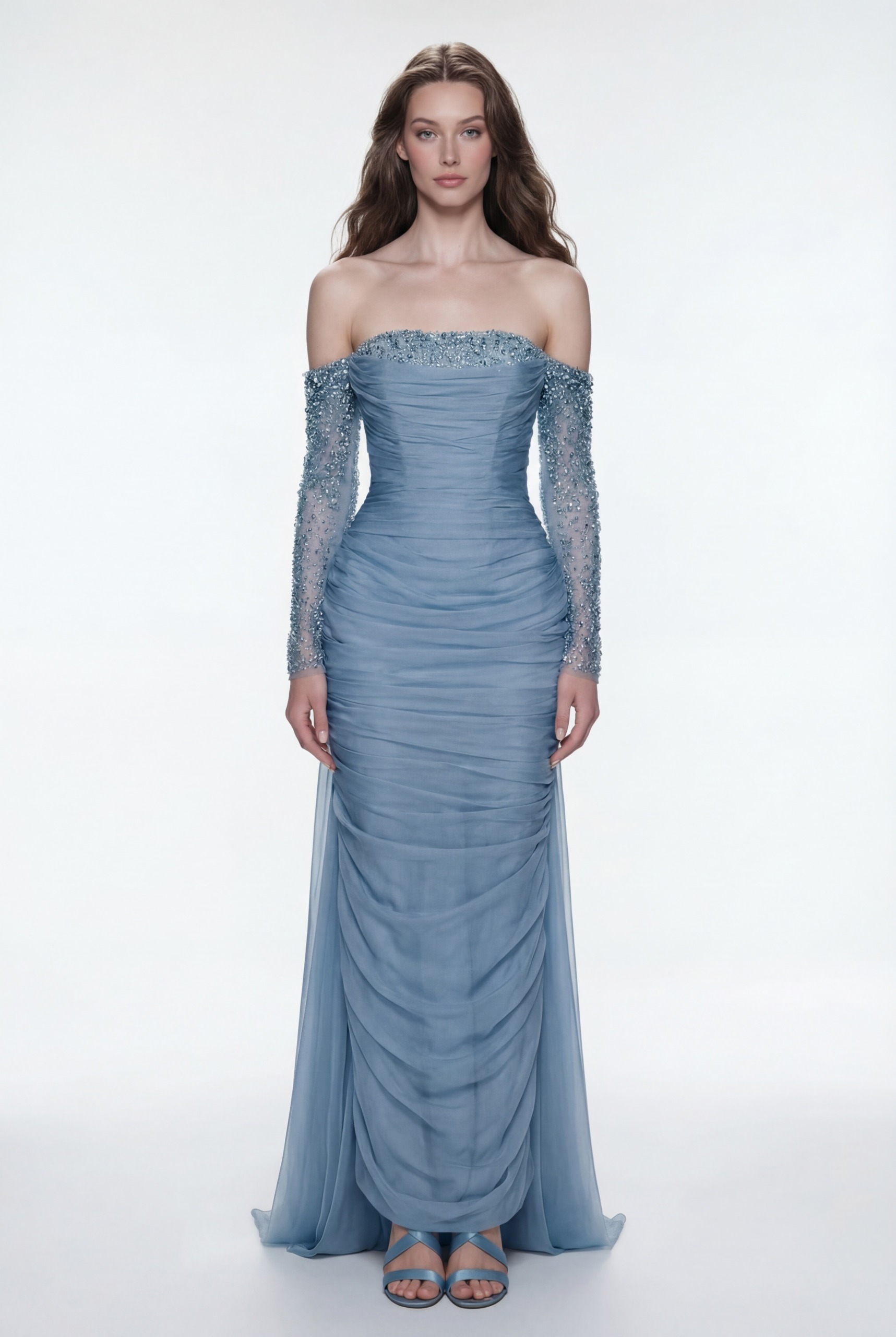 Designed with an elegant off-shoulder neckline, this evening dress features delicately handembellished sheer tulle sleeves that add refined sparkle and softness. The fitted bodice is shaped with subtle draping, creating a smooth and feminine silhouette that follows the natural lines of the body. The lightweight tulle overlay flows gracefully to a full-length hem, offering movement and depth while maintaining a clean and sophisticated look. Hand-applied crystal detailing along the neckline and sleeves enhances the design with understated luxury.