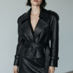 Keskin yaka formu, yapılandırılmış omuzları ve çift sıra düğme detayıyla güçlü bir siluet sunan deri ceket, aynı renkteki deri kemerle bel hattını zarif şekilde vurgular. Net panel dikişleri ve manşet detayları, tasarıma modern ve zamansız bir couture karakter kazandırır.
