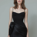 İnce askılı, heykelsi korsaj üstüyle dikkat çeken bu siyah mini elbise, hacim kazandıran saten drape etek detayıyla modern couture şıklığını bir araya getirir. Transparan etek ucu ile zarifçe tamamlanan tasarım, güçlü feminenliği sofistike bir duruşla buluşturur.