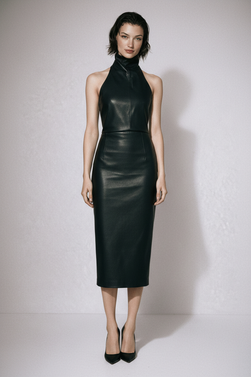 A halter neck couture dress crafted in smooth black leather, shaped with sharp tailoring that defines the waist and elongates the silhouette. Clean architectural lines and a flawless fit create a bold, modern statement with powerful feminine attitude.