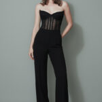 A striking jumpsuit featuring a structured lace corset bodice with defined boning and a flattering sweetheart neckline, paired with tailored wide-leg trousers for a sleek, elongated silhouette. Balancing sensual elegance with modern tailoring, it delivers a bold yet refined evening statement.
