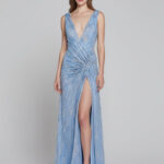 Derin V yaka formunda, belde toplanan drapeleriyle şekillenen ve yüksek yırtmaçlı akıcı eteğe açılan bir siluet. Üst beden yapısı formu netleştirirken etek hareket özgürlüğü sunar. Buz mavisi tonlarında, çizgisel kristal işlemelerle zenginleştirilmiş tül kumaş, tasarıma couture bir ışıltı kazandırır.