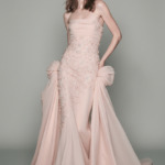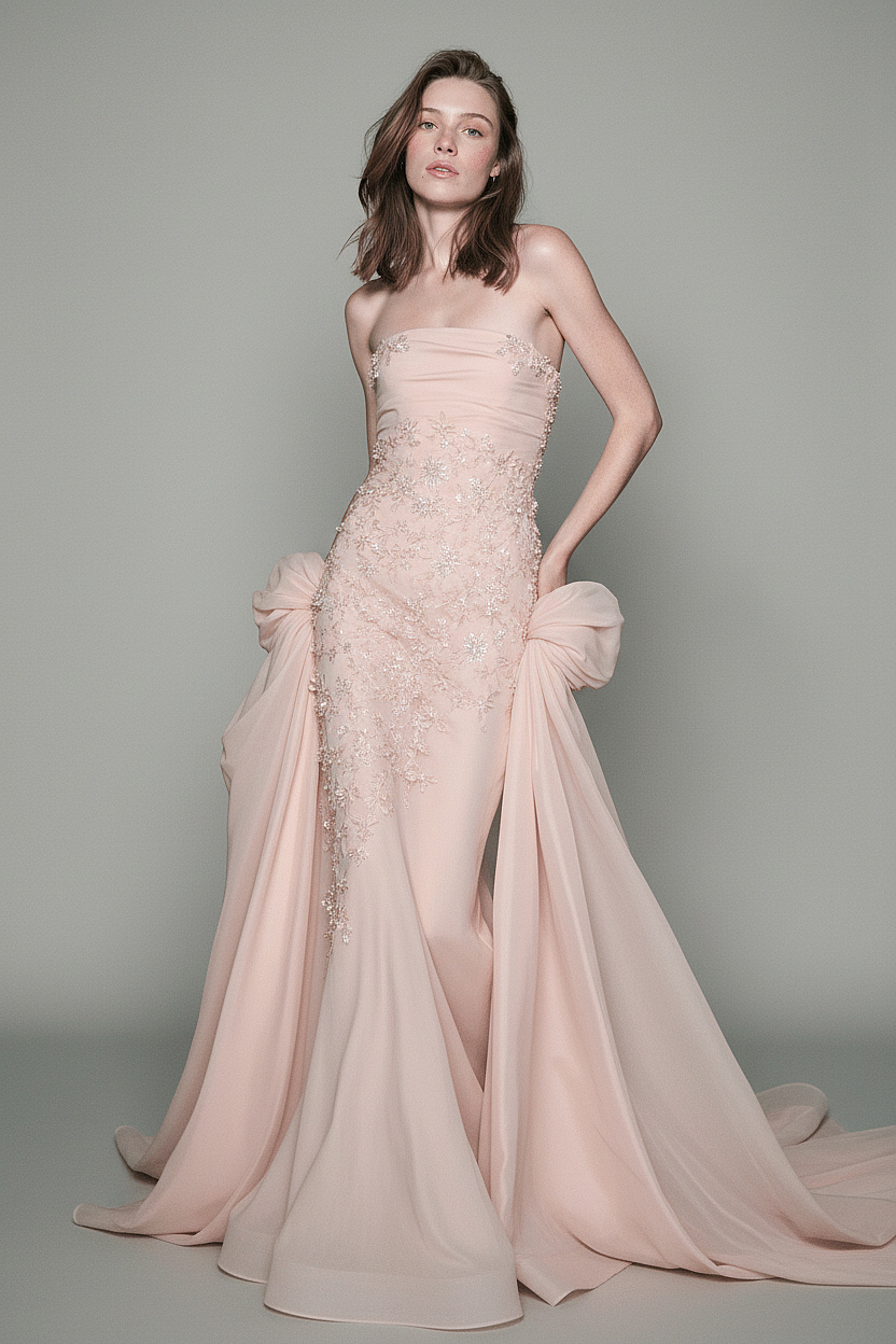 A romantic blush evening gown featuring delicate hand-embroidered floral embellishments and soft draped panels that create graceful, feminine movement.