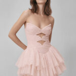 Straplez yakası, cesur kesik detayları ve kat kat tül eteğiyle modern ve ışıltılı bir görünüm sunan mini elbise.