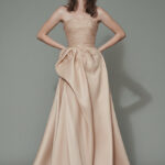 Işlemeli büstiyeri ve heykelsi mikado eteğiyle zarif yapı ve sofistike hacim sunan straplez couture elbise.