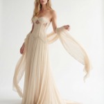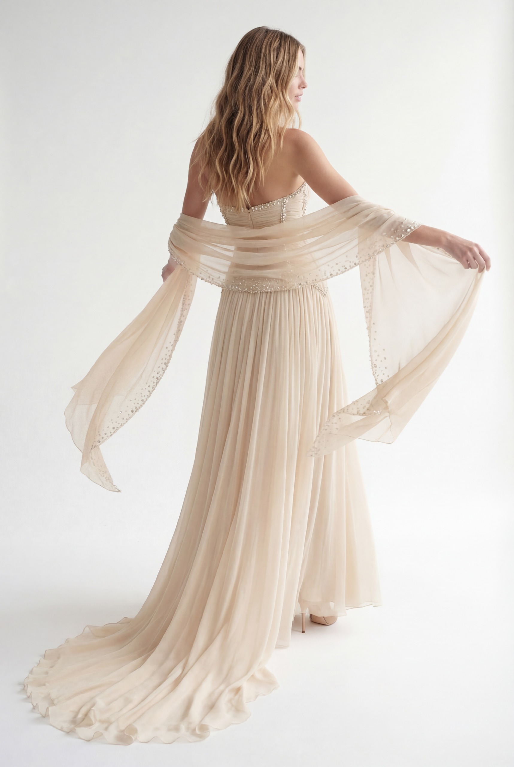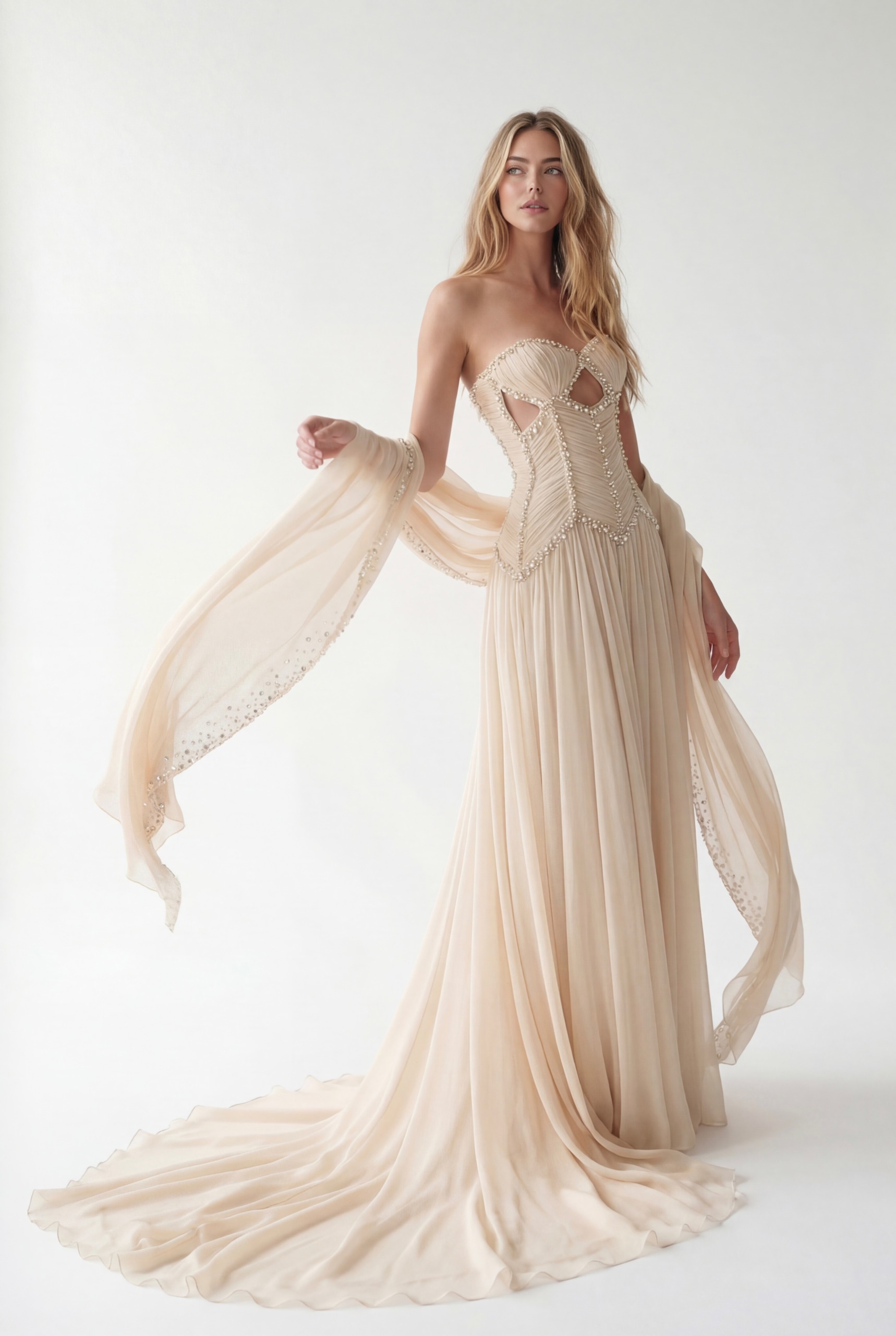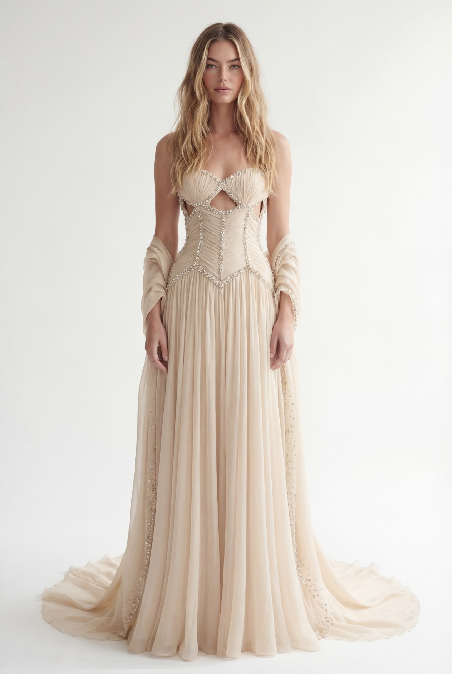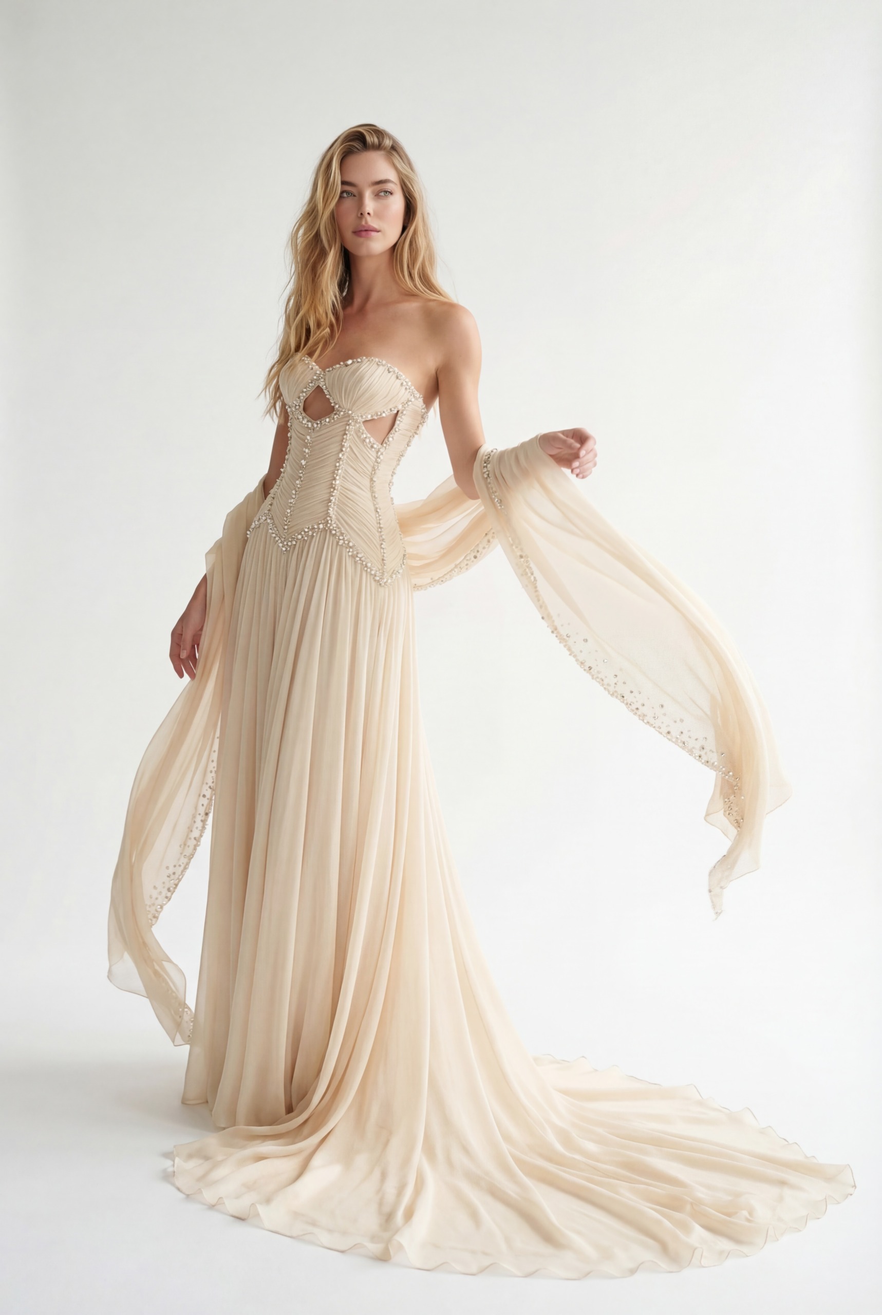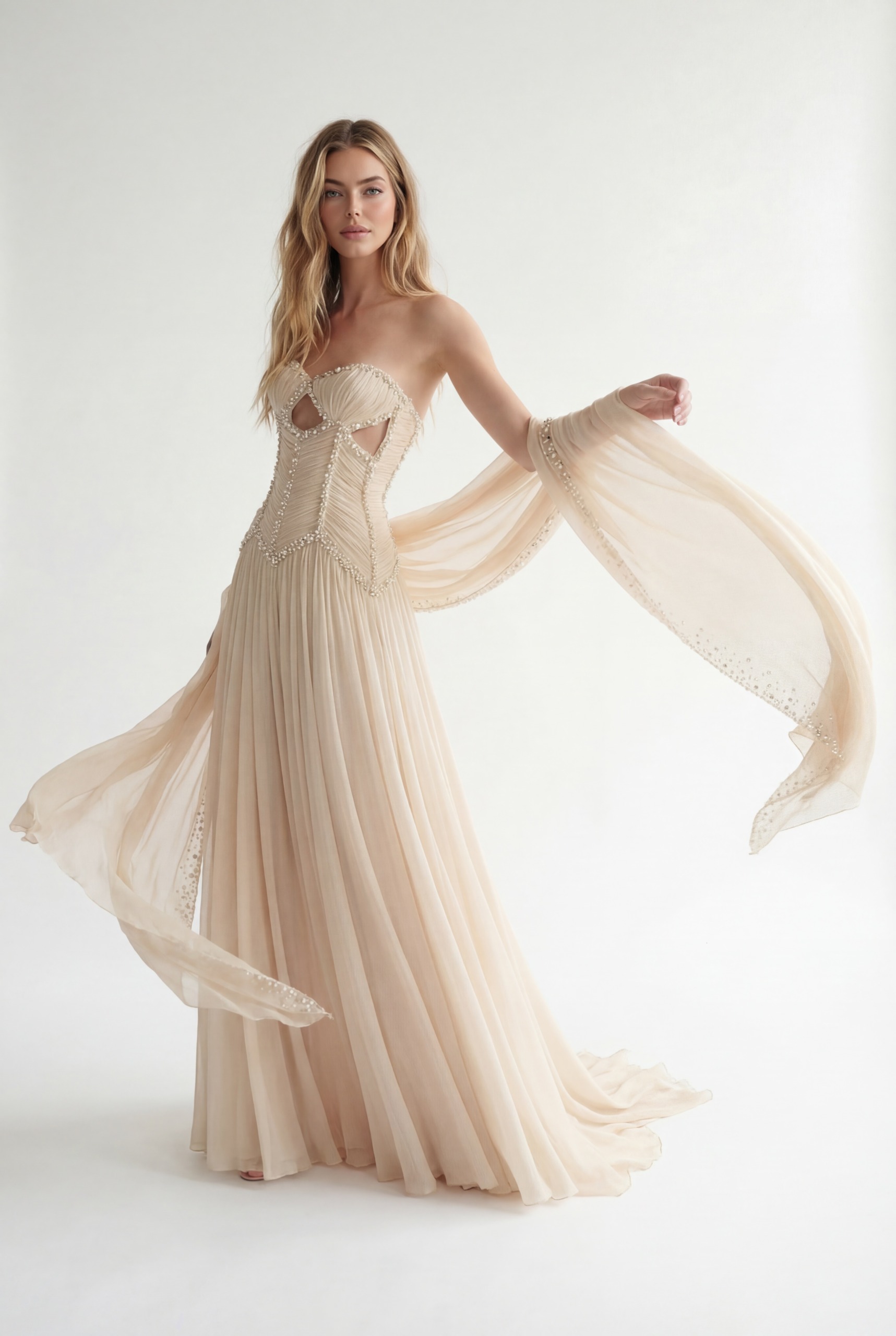 Soft champagne nude tones bring a delicate warmth to this elegant evening silhouette. The structured strapless corset bodice is shaped with precise paneling and sculpted boning, creating a refined and feminine form. Fine crystal and pearl embellishments trace the corset lines, highlighting the architectural structure while adding subtle couture luminosity.Delicate cut-out details at the bust introduce a modern touch, while the softly pleated chiffon skirt flows effortlessly from the waist to the floor. The lightweight fabric moves with graceful fluidity, creating a soft and airy presence with every step. Long draped chiffon embellished shawl extend from the arms, finished with delicate crystal accents that shimmer gently as they move. The combination of sculpted corsetry, intricate embellishment, and fluid chiffon layers creates a timeless couture aesthetic suited for refined evening events, elegant celebrations, or statement red-carpet moments.