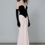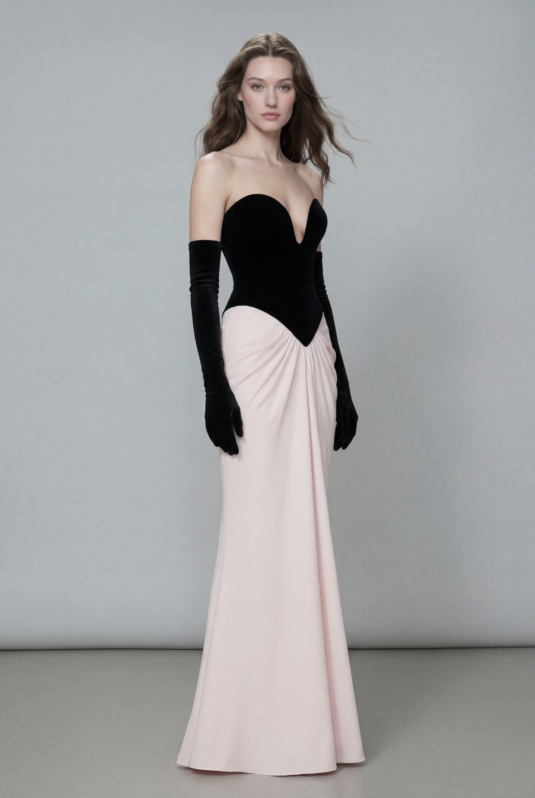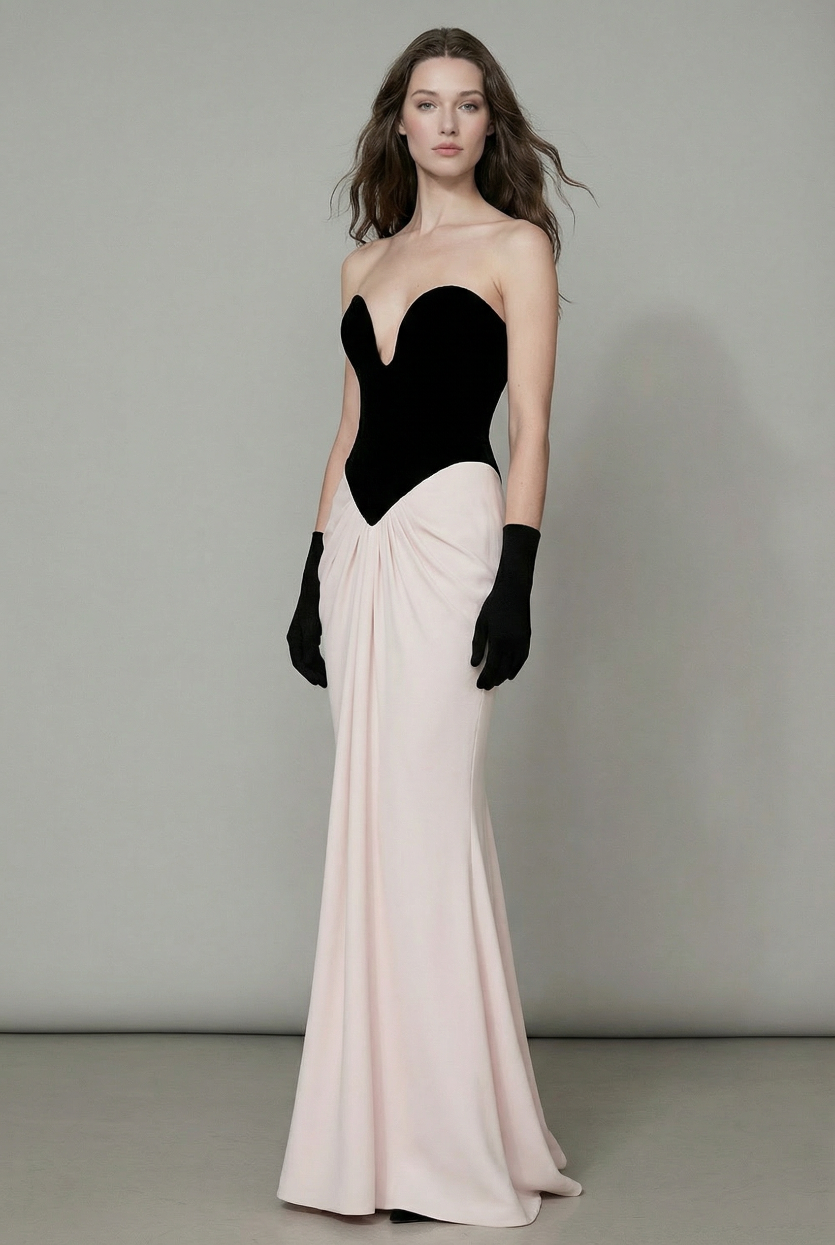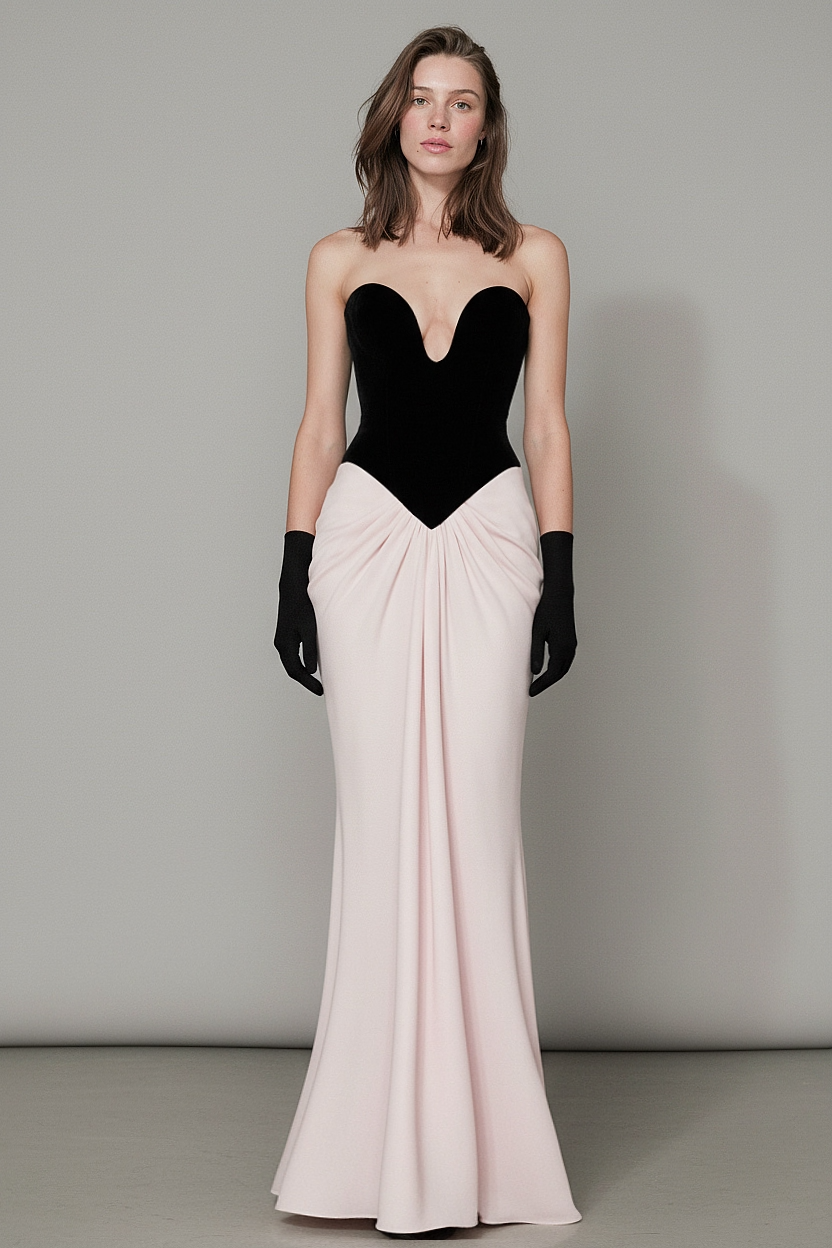 A striking strapless bodice paired with a softly draped blush skirt, creating an elegant and refined evening look.