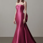 İç korsajla desteklenen straplez üst yapı, balık kesim bir siluete uzanır. Dikey dikiş hatları formu netleştirirken, arkadaki büyük fiyonk detayı yumuşak bir kuyrukla devam ederek hacim ve akıcı bir etki kazandırır.