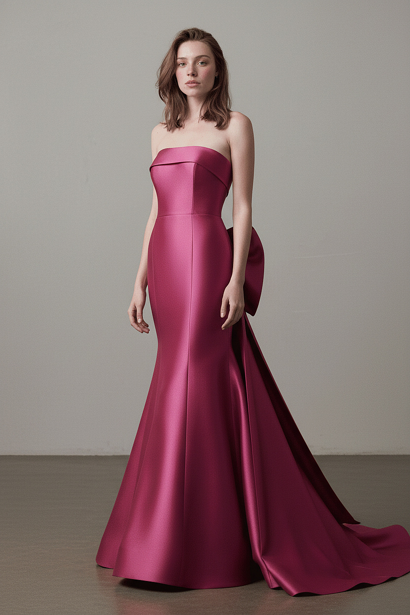 A strapless, corset-built bodice shapes the upper form, extending into a sleek mermaid silhouette. Clean vertical seams enhance the line of the body, while a dramatic back bow detail flows into a soft train, adding volume and refined movement.