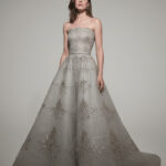 Straplez ve yapılandırılmış üst form, beli vurgulayarak geniş A kesim eteğe açılır. Yumuşak tül katmanlar üzerine uygulanan el işi gümüş işlemeler derinlik ve ışıltı kazandırırken, hafif kuyruklu etek hacimli ve zarif bir duruş oluşturur.