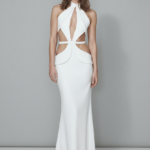 A clean halter neckline frames the décolletage, while sculpted cut-outs define the waist with architectural precision. Crafted in fluid crepe, the elongated silhouette delivers a modern and confident statement perfect for contemporary ceremonies or events.