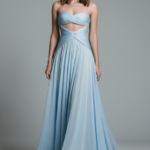 A strapless evening dress designed with elegant twisted draping on the bust and a refined cut-out detail at the waist, creating a feminine and elongated silhouette. The softly flowing chiffon skirt adds movement and lightness, making the dress ideal for special nights with a modern, graceful attitude.