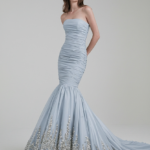 Büzgülü gövdeye sahip, eteği ve kuyruğu kristal işlemelerle tamamlanan buz mavisi romantik mermaid elbise. Zarif, feminen ve dikkat çekici lükste bir siluet sunar.