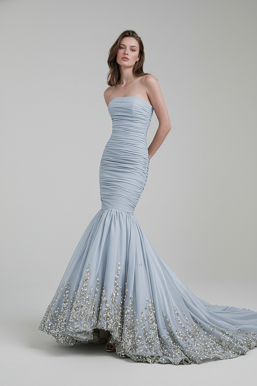 A romantic ice blue mermaid gown featuring a ruched fitted bodice and a dramatic flared skirt finished with shimmering crystal embellishments along the hem and train. Elegant, feminine, and strikingly luxurious.