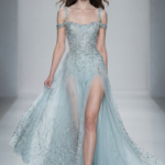 Yumuşak ice blue tonunda, soğuk gümüş alt yansımalarla tasarlanan bu gece elbisesi; gövde ve etek boyunca uzanan kristal işlemeleriyle zarif bir ışıltı sunar. Korse formundaki üst yapı silueti dengeli şekilde vurgularken, hafif ve akışkan tül etek tasarımı elbiseye hareket kazandırır. İnce askı ve omuz detayları feminen bir görünüm sağlarken, yırtmaçlı etek formu modern ve sofistike bir duruş yaratır. Özel davetler, gala geceleri ve couture organizasyonlar için ideal bir seçimdir.