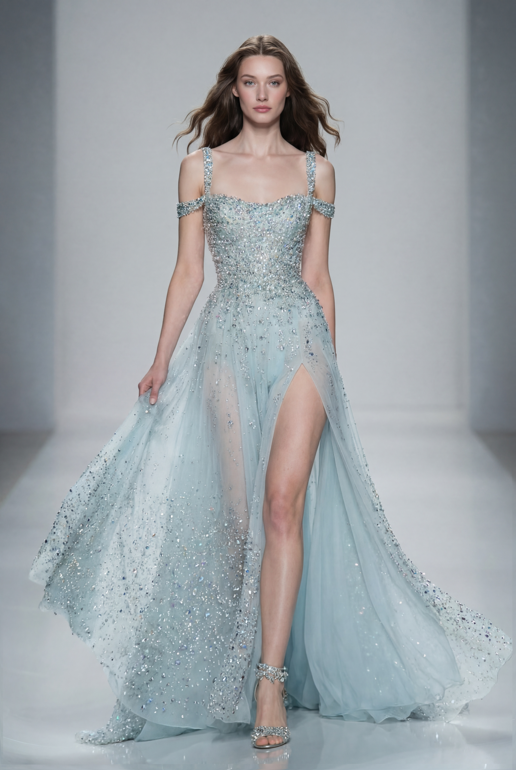 An exquisite evening dress designed in a soft ice blue tone with frosted silver undertones, enriched with delicate crystal embellishments throughout the bodice and skirt. The structured corset-style upper creates a refined silhouette, while the light tulle skirt flows effortlessly with a subtle shimmer. Slender straps and softly draped shoulder details add femininity, balanced by a high slit that enhances movement and modern elegance. Ideal for red carpet appearances, couture evenings, and special occasions where refined sparkle and timeless design meet.