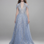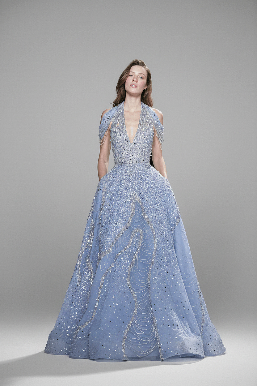 Derin halter yaka ve yapılandırılmış korse formuyla şekillenen A-kesim siluet, el işçiliği kristal ve boncuk işlemelerle tamamen kaplanmıştır. Katmanlı tül panellerden oluşan etek, hacimli ve akışkan bir duruş sunarken buz mavisi tonuyla ışıltılı bir etki yaratır.