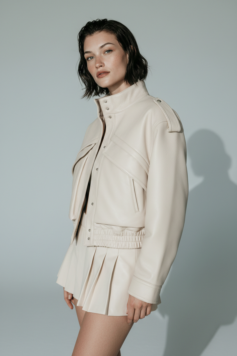 Yüksek yapılandırılmış yaka formu, mimari panel dikişleri ve apolet detaylı omuzlarıyla tasarlanan deri ceket, arkada elastik bel hattı ve net kalıp yapısıyla dengeli ve güçlü bir siluet sunar. Temiz ön kapama, kusursuz dikiş işçiligi ve zarif oranlar, modern fonksiyonelliği zamansız couture çizgisiyle birleştirir.