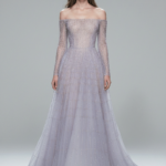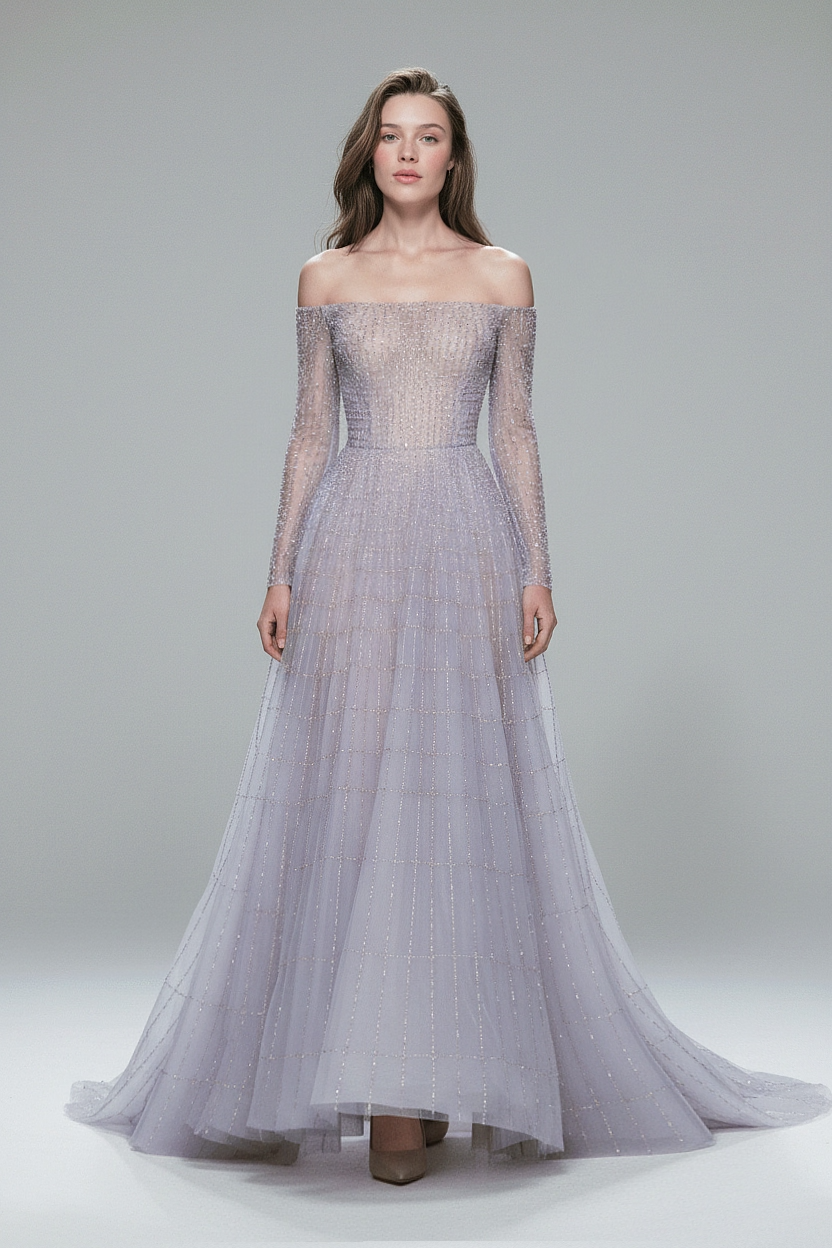 An off-shoulder silhouette defined by a structured corset bodice and a gently flared A-line skirt. The transparent tulle is fully embellished with vertical crystal embroidery, creating refined luminosity and depth. Long fitted sleeves in sheer tulle balance the sculpted waist, while the floor-length skirt flows softly with layered volume and a light train.