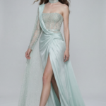 Yumuşak mint ice tonunda tasarlanan bu tek omuzlu elbise, pürüzsüz saten kumaşı şeffaf detaylarla bir araya getirir. El işçiliği işlemelerle zenginleştirilen üst form, tasarıma ince bir ışıltı katarken, asimetrik yaka hattı işlemeli choker detayıyla modern bir görünüm sunar. Omuzdan dökülen şeffaf ve işlemeli kol, elbiseye hafiflik ve zarafet kazandırır. Bel kısmındaki drape yapı ve yırtmaçlı etek formu, akıcı hareket ve feminen bir siluet oluşturur. Özel davetler ve şık geceler için tasarlanmış sofistike bir elbisedir.