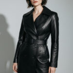 A couture cut leather trench coat shaped with sharp lapels, a double breasted front, and a precisely contoured waist enhanced by a matching belt. Clean panel seams and a midi length silhouette create an elongated, powerful line, balancing strong tailoring with refined feminine elegance.