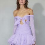 Düşük omuzlu yaka ve yumuşak drapeler korsajı şekillendirirken, hafif volanlı mini etekle birleşerek havadar ve romantik bir siluet sunar.