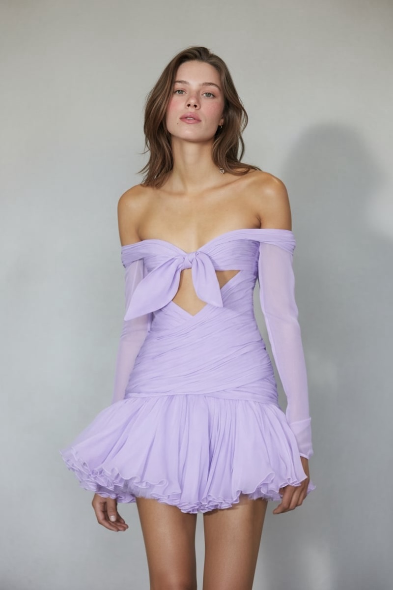 An off-shoulder neckline with soft draping shapes the bodice, flowing into a lightly flounced mini skirt for an airy, romantic silhouette.