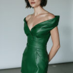 Omuzları açık, beli saran sarma detaylı gövdesiyle zümrüt yeşili deri mini tasarım. Vücudu saran üst form ve kısa etek boyu, silueti güçlü ve feminen bir çizgide tamamlar.