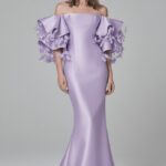 A refined off-shoulder evening dress featuring layered statement sleeves and a sleek fitted silhouette with a couture atelier touch