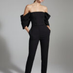A strapless bustier with off-shoulder detailing flows into tailored trousers, creating a strong, modern, and refined silhouette.