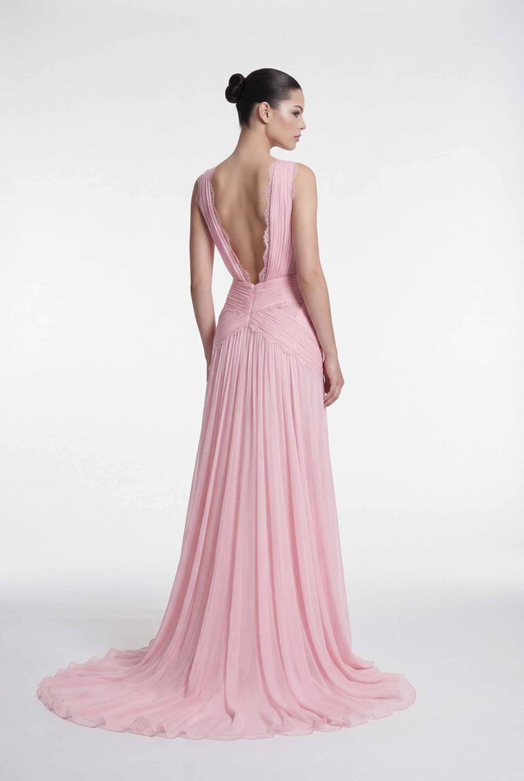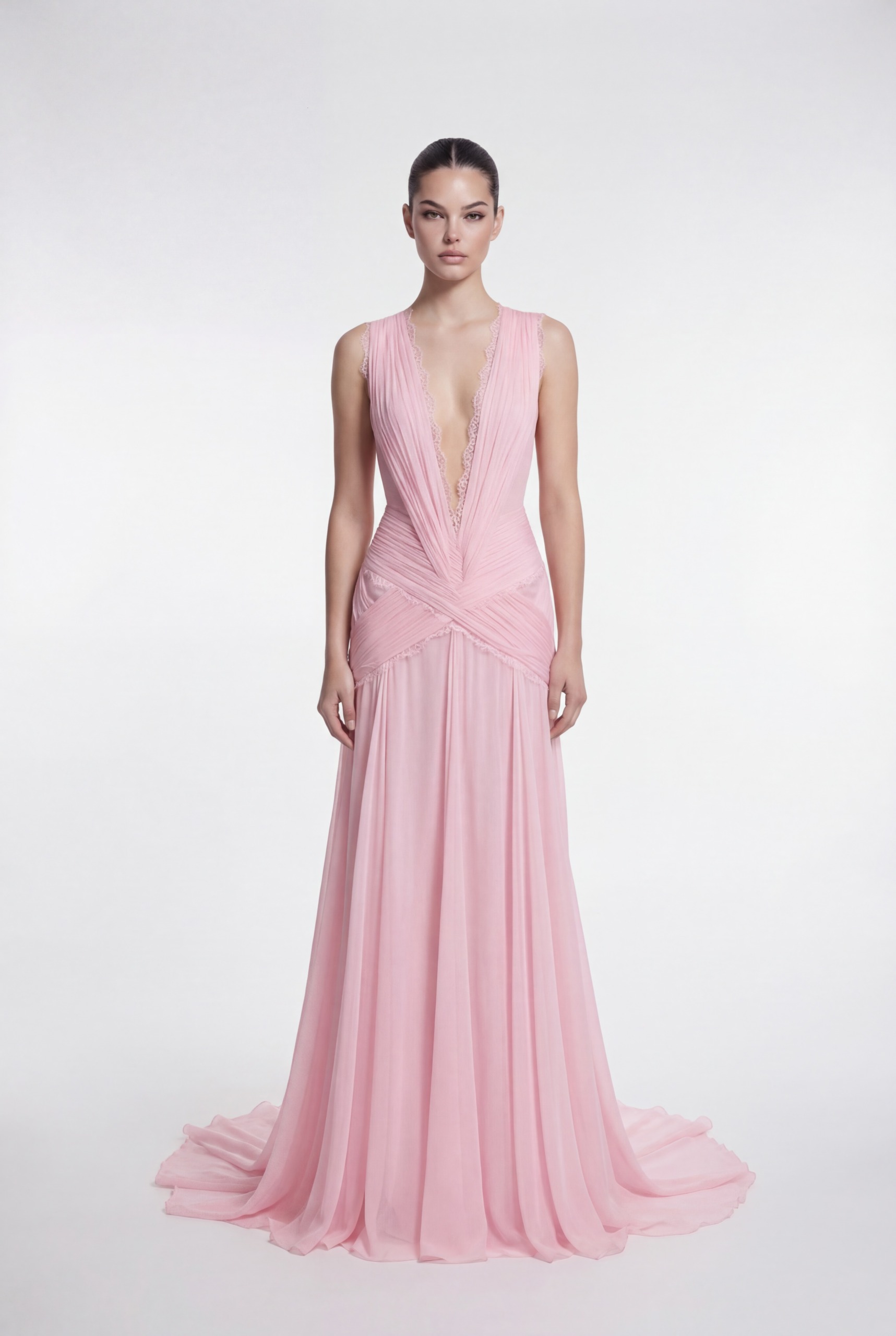 Flowing with delicate movement, this chiffon evening dress is designed with soft draping that enhances the body in a naturally elegant way. The deep V neckline is framed with subtle lace detailing, adding a refined femininity while maintaining a light and effortless feel. The gathered bodice defines the waist and transitions into a fluid, floor-length skirt that moves gracefully with every step. Crafted in a soft pink tone, this piece is ideal for evening occasions, weddings, or romantic celebrations, offering a timeless and ethereal presence.