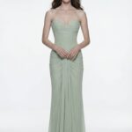Soft pistachio green chiffon creates an elegant and elongated silhouette in this refined evening dress. The strapless bodice features a softly sculpted sweetheart neckline with delicate draping across the bust, while the structured corset construction enhances the waist and creates a beautifully defined feminine shape. Gentle draping continues through the hips, where gathered chiffon details add dimension and fluid movement to the design. A softly cascading panel falls from the waistline, extending vertically through the skirt and emphasizing the length of the silhouette. The lightweight chiffon skirt flows effortlessly to the floor, creating graceful movement with every step. The balance between structured corsetry and fluid draping makes this dress an elegant choice for formal evenings, sophisticated events, and timeless occasion dressing.