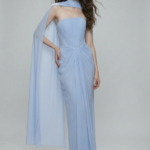 Zarif straplez yaka kesimiyle tasarlanan bu abiye, vücuda uyum sağlayan ince pile detaylarıyla akıcı ve uzun bir siluet sunar. Hafif şifon kumaş, doğal bir hareket kazandırarak her adımda yumuşak bir akış yaratır. Omuzlardan dökülen şeffaf pelerin detayı, tasarıma modern ve couture bir karakter katarak hafifliği ve şıklığı ön plana çıkarır. Dengeli yapısı sayesinde minimal zarafeti ve sofistike duruşu bir arada sunar.