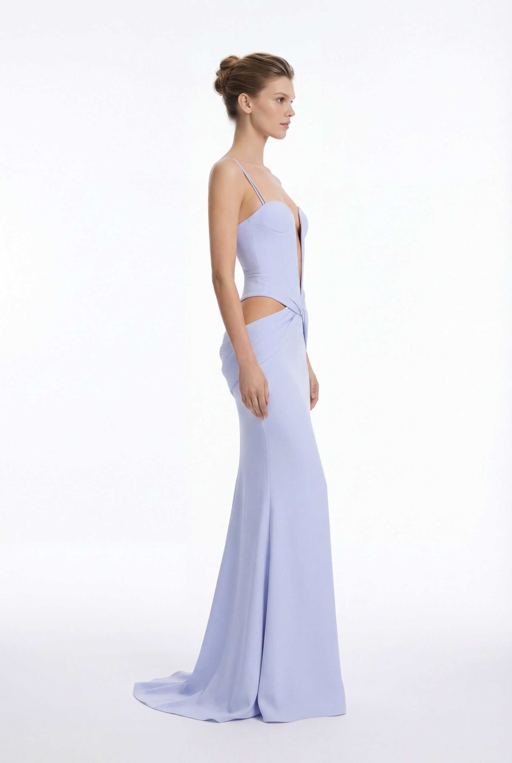 Side cut-outs define the waist with a clean, contemporary attitude, seamlessly connecting to soft draping across the hips. The skirt falls into a refined mermaid shape, elongating the figure with a smooth, uninterrupted flow. The stretch crepe fabric enhances the form with a sleek, second-skin feel, offering both structure and comfort in motion.