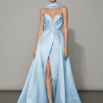 Drapeli bağlama detaylı büstiyer, zarif öndeki yırtmaç ve akıcı yapıdaki eteği ile modern couture zarafeti sunan pudra mavisi gece elbisesi.