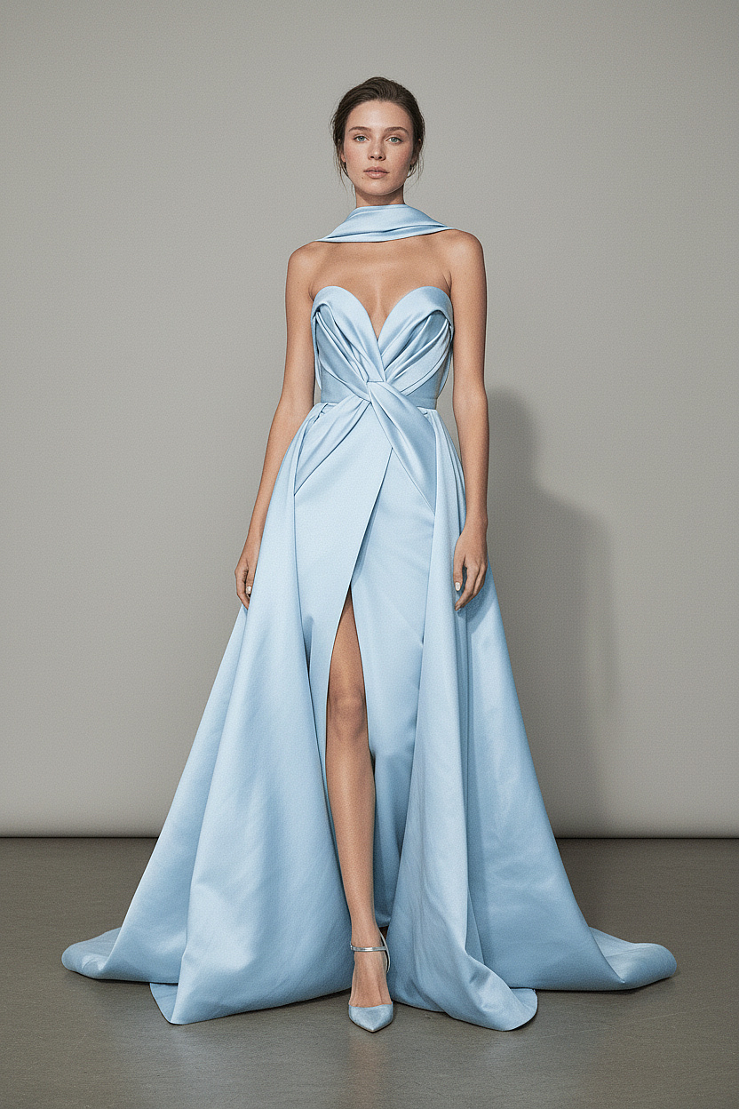 A sculpted powder blue evening gown featuring a dramatic twisted bodice, elegant front slit, and flowing structured skirt for a modern couture statement.