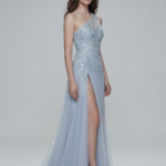 Zarif buz mavisi tonunda tasarlanan bu tek omuzlu elbise, hafif ve akıcı tül kumaştan üretilmiştir. Asimetrik yaka formu, şeffaf tül detayla tamamlanırken, gövde üzerindeki kristal ve boncuk el işçiliği tasarıma ışıltı ve derinlik katar. Bel kısmındaki drape yapı vücut formunu dengeli şekilde vurgular, yüksek yırtmaçlı etek formu ise hareket özgürlüğü ve feminen bir etki sunar. Davetler, özel geceler ve şık organizasyonlar için tasarlanmış sofistike bir elbisedir.