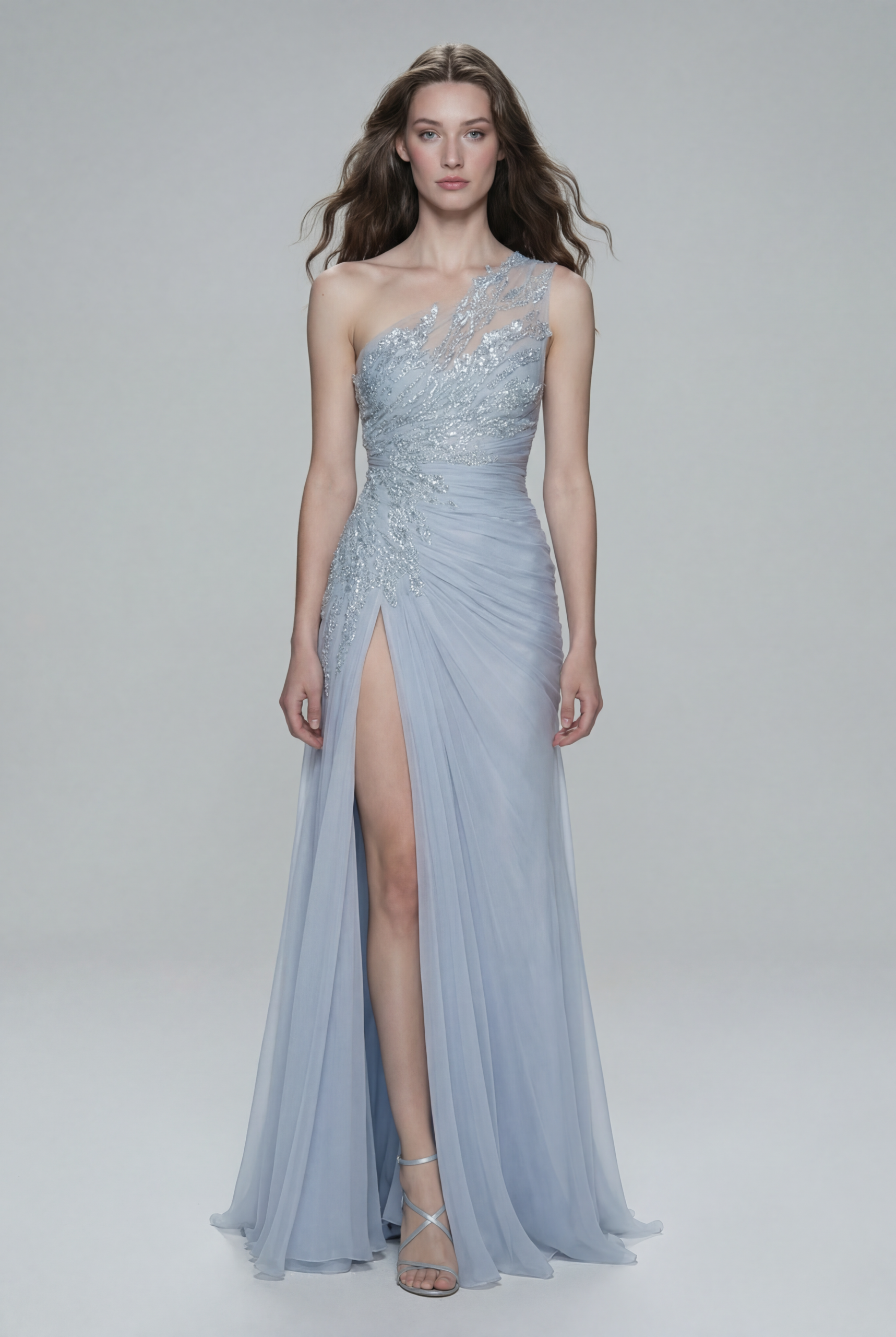 An elegant one shoulder dress designed in a refined ice blue tone, crafted from soft, flowing tulle with intricate hand embellishment. The asymmetrical neckline is enhanced with sheer detailing, while crystal and bead embellishments are arranged in fluid patterns across the bodice, creating depth and subtle sparkle. Gentle draping at the waist shapes the silhouette, leading into a softly flowing skirt with a high slit that adds movement and femininity. Designed for evening events and special occasions, this dress combines modern elegance with couture level detailing.