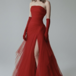İç korsaj yapısıyla form kazandırılan straplez üst beden, belden itibaren yumuşak drapeli ve yüksek yırtmaçlı tül etekle devam eder. Şeffaf katmanlar hacim ve akışkanlık sağlarken, aynı tül kumaştan uzun eldivenler tasarımı tamamlar. Yoğun kırmızı tül dokusu, güçlü yapı ile hafifliği bir arada sunar.