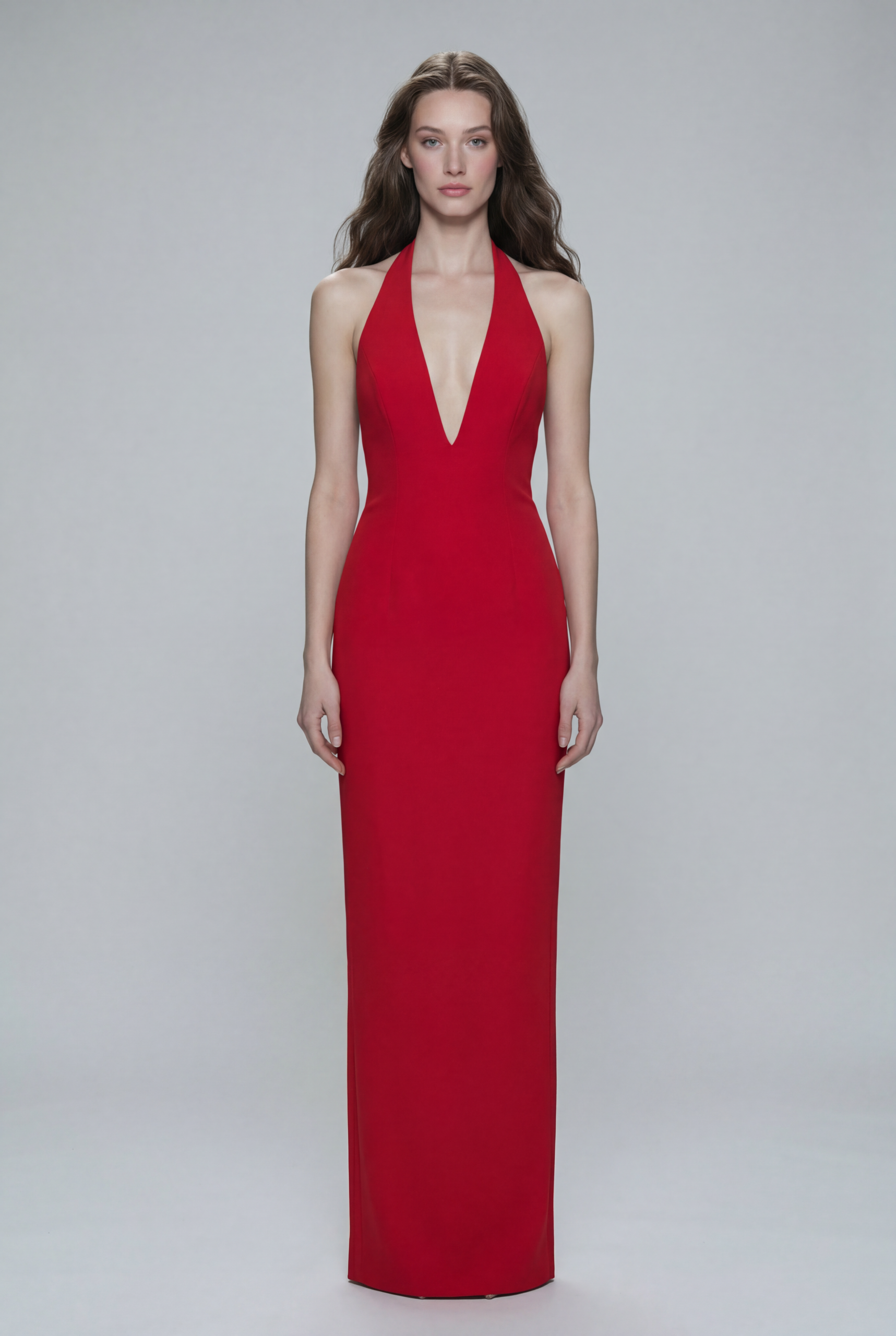 This striking evening dress is crafted from smooth, structured crepe in a bold red tone. The halter-neck design frames the shoulders beautifully while the deep V neckline adds a confident, feminine allure. Clean lines and a perfectly tailored silhouette follow the body effortlessly, extending into a long, streamlined skirt that elongates the figure. Minimal yet powerful, this dress is designed for women who prefer timeless elegance with a modern edge—ideal for evening events, galas, and special occasions where simplicity speaks volumes.