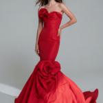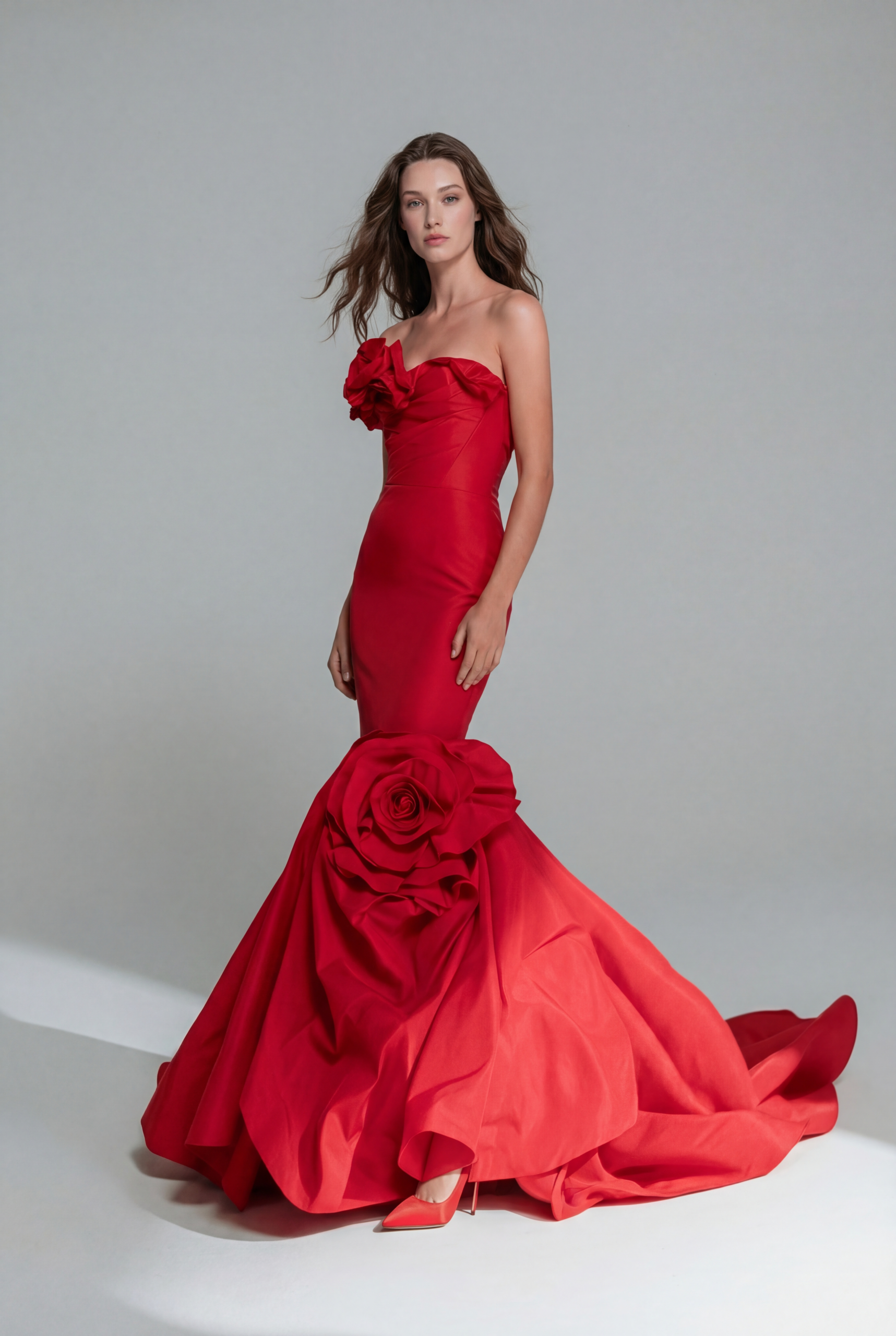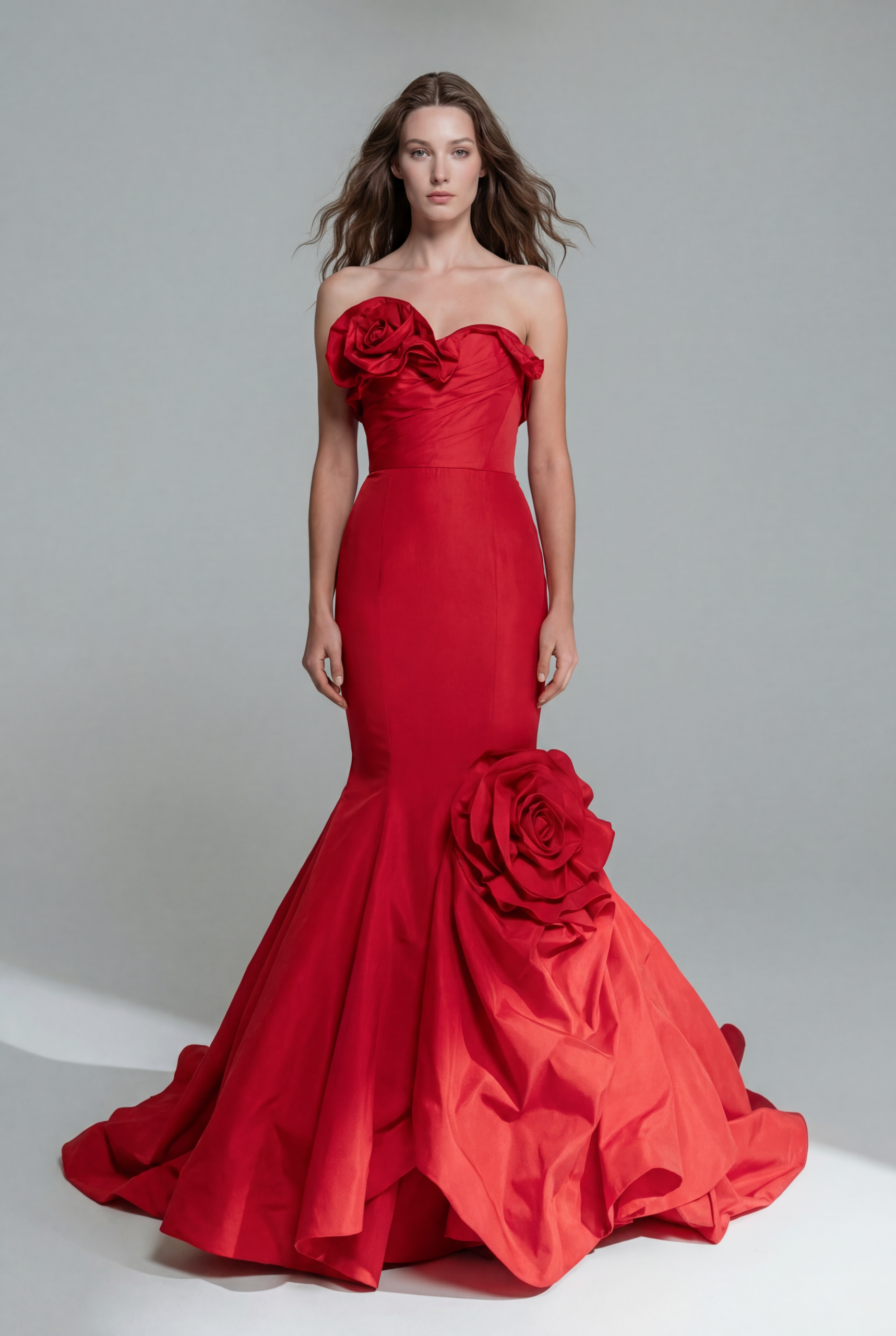 An eye-catching off-shoulder evening dress designed with a fitted mermaid silhouette. The bold rose details on the neckline and skirt add strong character and dramatic movement, creating a powerful and standout look for special events.