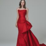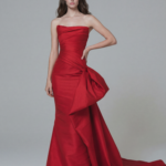 Yapılı mikado kumaştan hazırlanmış bu çarpıcı straplez elbise, heykelsi drapeler ve dramatik yan fiyonk detayıyla gösterişli bir kuyrukla tamamlanır.