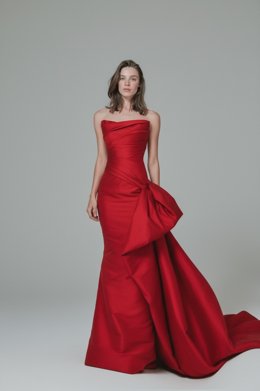 A striking strapless gown crafted in structured mikado with sculpted draping and a dramatic side bow, flowing into a grand train.