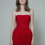 Straplez siluet, tüm yüzeydeki büzgü detaylarıyla bedeni akıcı bir şekilde sararak cesur ve çekici bir mini görünüm sunar.