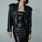 The cropped biker jacket completes the look with sharp lapels, structured shoulders, and clean metal zippers, creating a powerful balance between feminine elegance and modern edge.