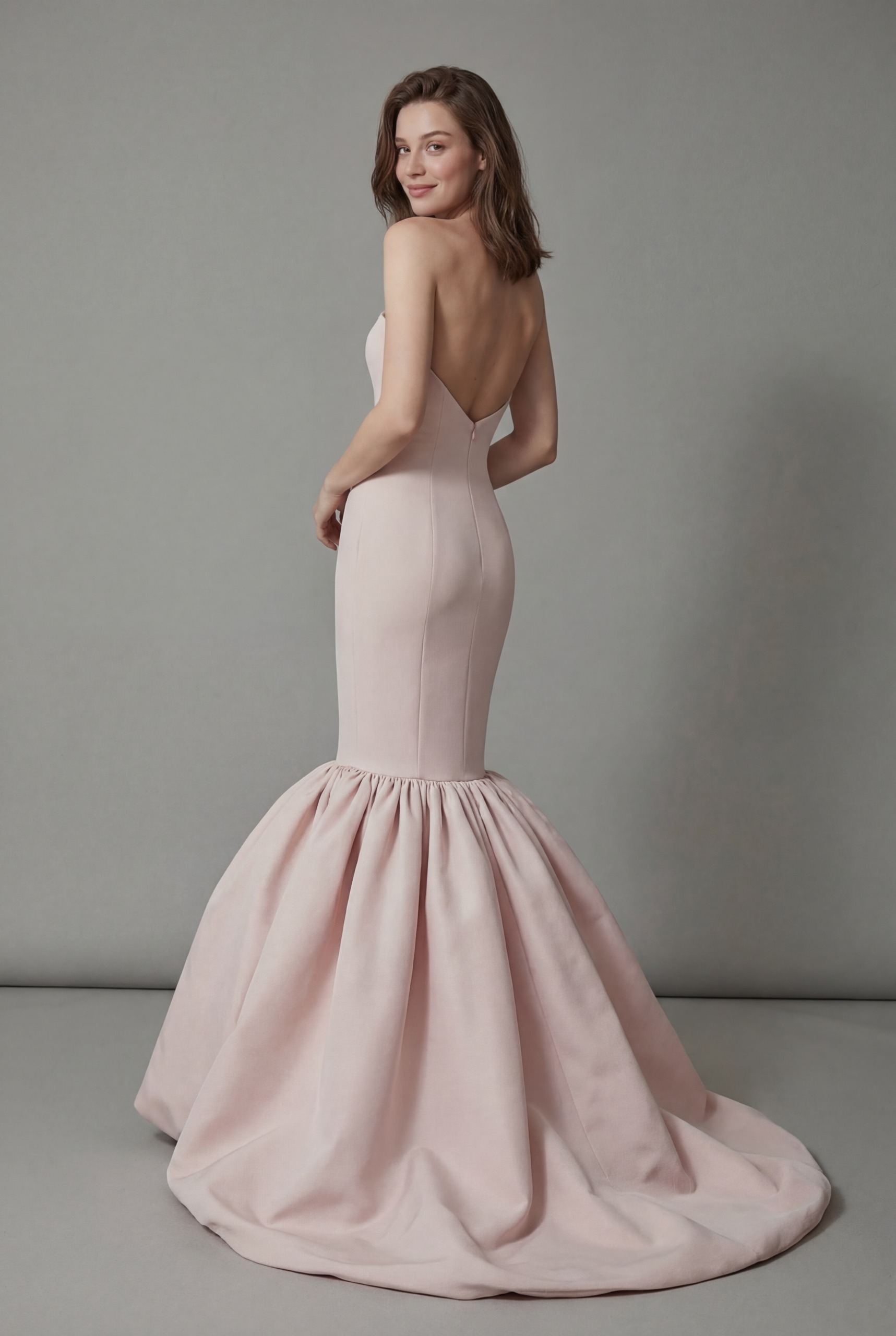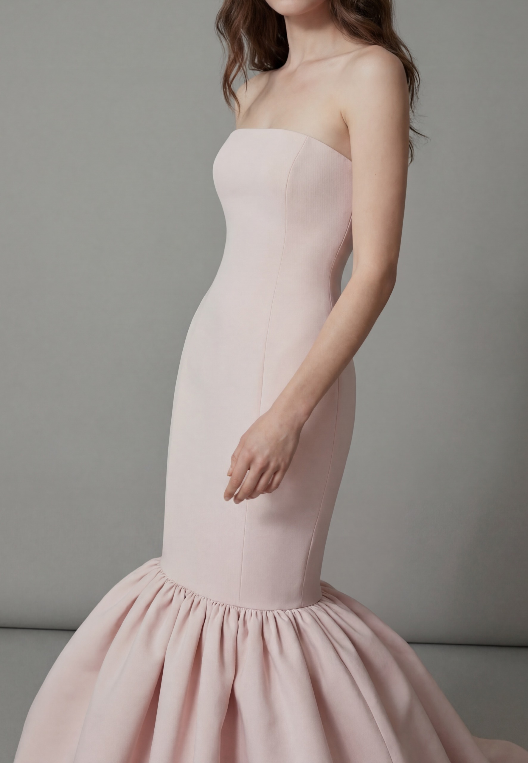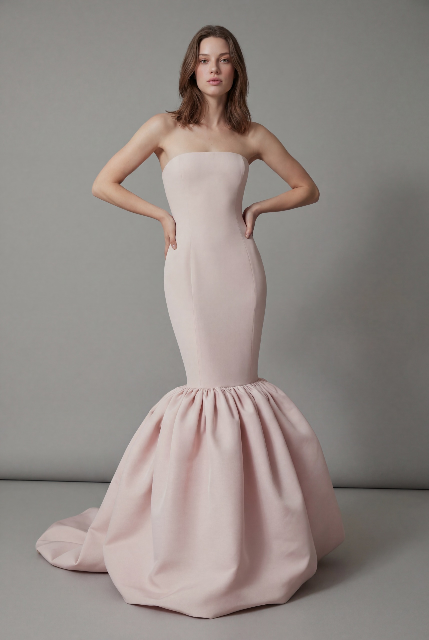 A sleek strapless gown that contours the body before blooming into a dramatic gathered balloon hem and flowing train, creating a modern yet timeless couture silhouette.