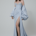 A couture-inspired iceblue gown featuring a sculpted draped silhouette, hand-embellished corset, and a high-slit skirt for modern elegance.