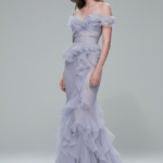 Omuzları açık yaka formu, hafif tül fırfırlarla gövdeyi çevreler ve iç korsaj yapısı bel hattını belirginleştirir. Vücuda oturan form, etekte balık kesime dönüşerek katmanlı tül volanlarla tamamlanır; etek ucunda akıcı hacim ve zarif bir hareket etkisi oluşturur.