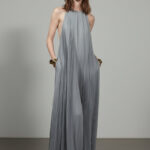 Halter yaka omuzları zarifçe çerçevelerken, ince piliseli kumaş beden boyunca zahmetsizce akış sağlar. Akıcı silüet her adımda doğal bir hareket sunarak rahat ama sofistike bir şıklık yaratır. Minimal, modern ve zamansız—akşam davetleri, destinasyon etkinlikleri veya çağdaş törenler için tasarlanmıştır.